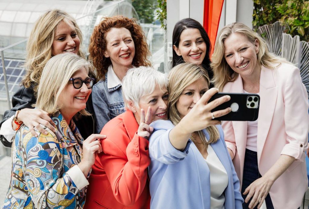 La iluminación es suave y natural, probablemente luz diurna difusa, que realza los tonos de piel y mantiene un ambiente fresco. Los colores de la ropa son vibrantes y variados: chaquetas en tonos pastel y brillantes, patrones coloridos y piezas modernas, lo que aporta un estilo elegante, profesional y a la vez casual. El fondo muestra un entorno urbano con elementos de vidrio, arquitectura contemporánea y vegetación, pero ligeramente desenfocado para mantener el foco en el grupo.